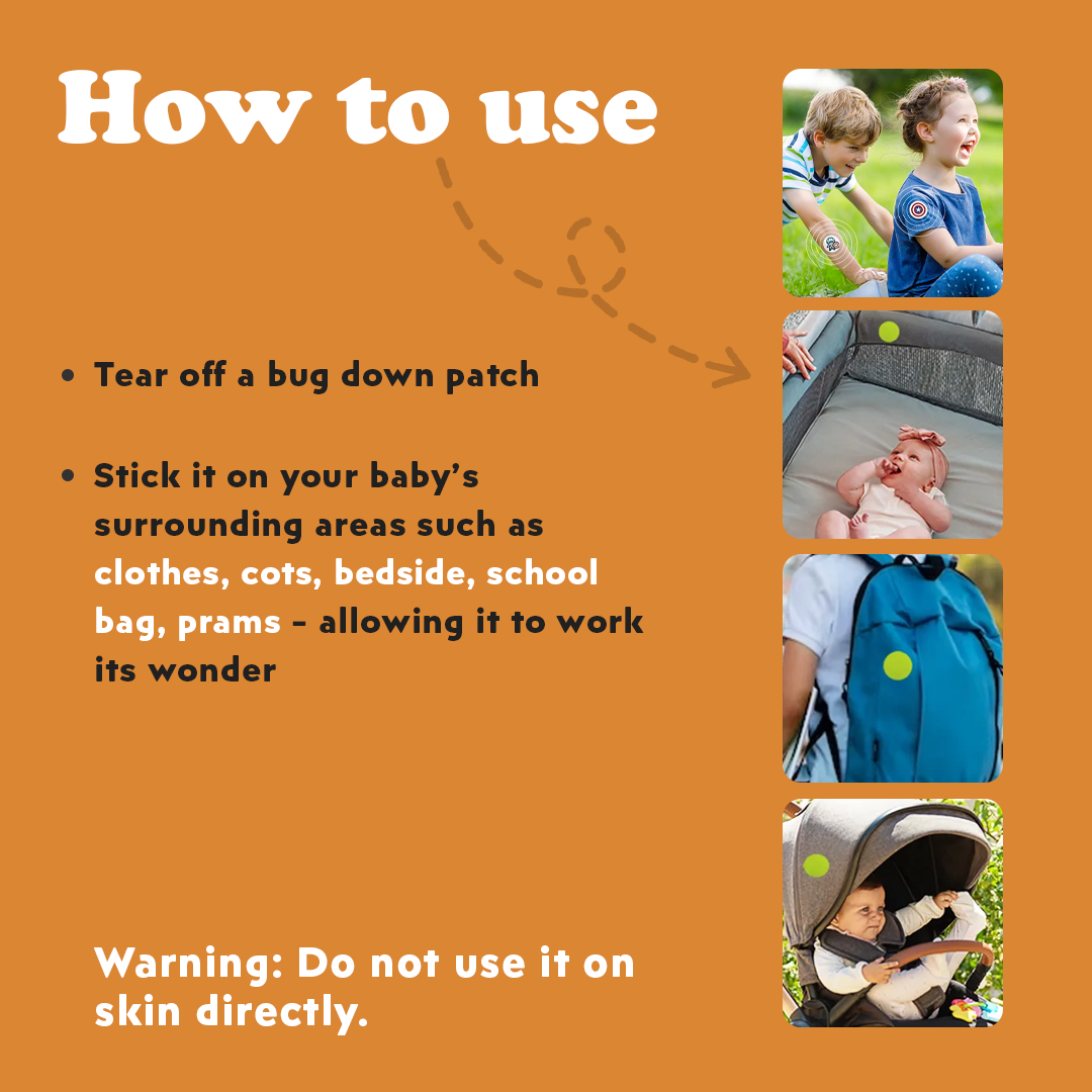 For best results, peel off the patch and stick it onto clothes, hats, strollers, backpacks, or camping gear. We recommend placing them near exposed skin areas (like on a sleeve or collar) without covering the skin directly.