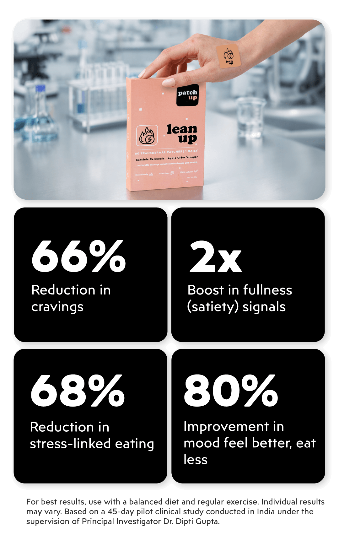 Lean Up is the solution for you. Backed by clinically proven ingredients, its transdermal patches deliver Garcinia Cambogia and Apple Cider Vinegar directly into the bloodstream, supporting improved metabolism, fat reduction, and gut health.
